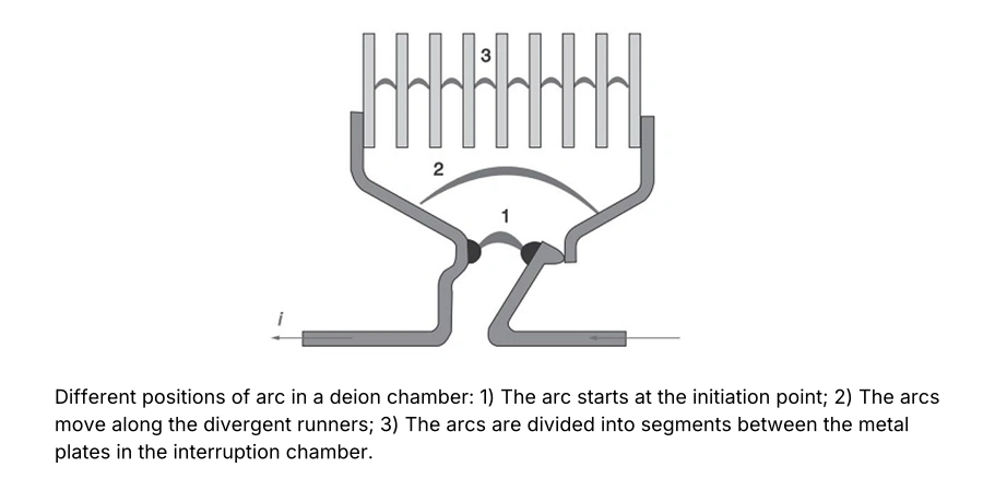 The arc chute directs this arc into its series of metal plates, splitting it into smaller parts. This lengthens the arc’s path, increasing its electrical resistance and reducing current flow, while the plates absorb heat to cool the ionized gases. The rapid cooling and lengthening process deionizes the arc path, preventing re-ignition and extinguishing the arc in milliseconds.